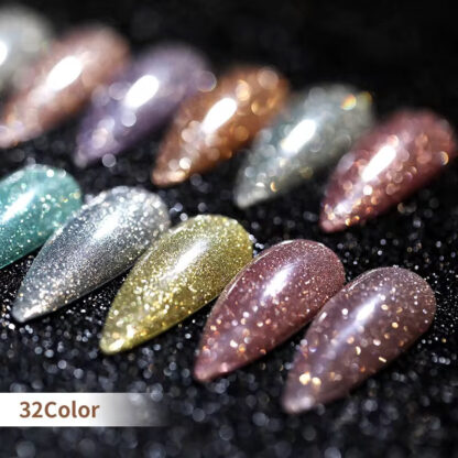 Transformez vos manucures avec notre vernis semi-permanent scintillant réfléchissant. Sa texture lumineuse et riche en particules brillantes crée un effet spectaculaire sous toutes les lumières, et encore plus éclatant sous éclairage direct.